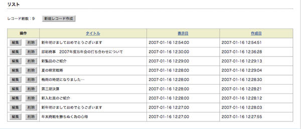 が行えます。新たな内容を追加するには、「新規レコード(内容)作成」ボタンをクリックします。
