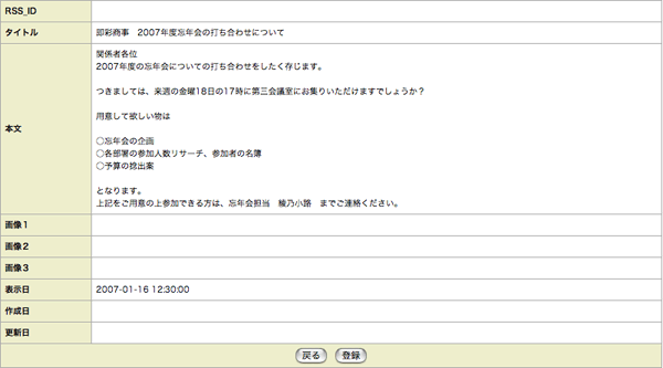 「タイトル」「本文」「画像のアップロード指定」「この内容を表示する(した)日時※1」